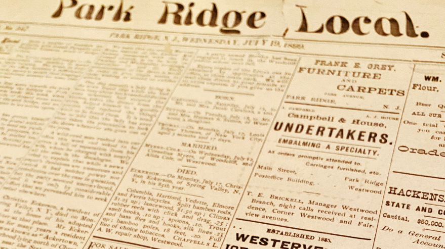 PARK RIDGE—This week, we go back 125 years to see what was being reported in the Park Ridge Local, the Pascack Valley’s first newspaper. This simple weekly paper did not have any bold headlines, photographs, or spot color. The six columns on its front page offered news briefs about what was happening in the lives of the local people. Sometimes, as you will read here, there would be thinly veiled (and rather amusing) editorial commentary on local issues. Three pages of advertisements, syndicated national news, household and farming tips, and short stories made up the remainder of the four-page folio.